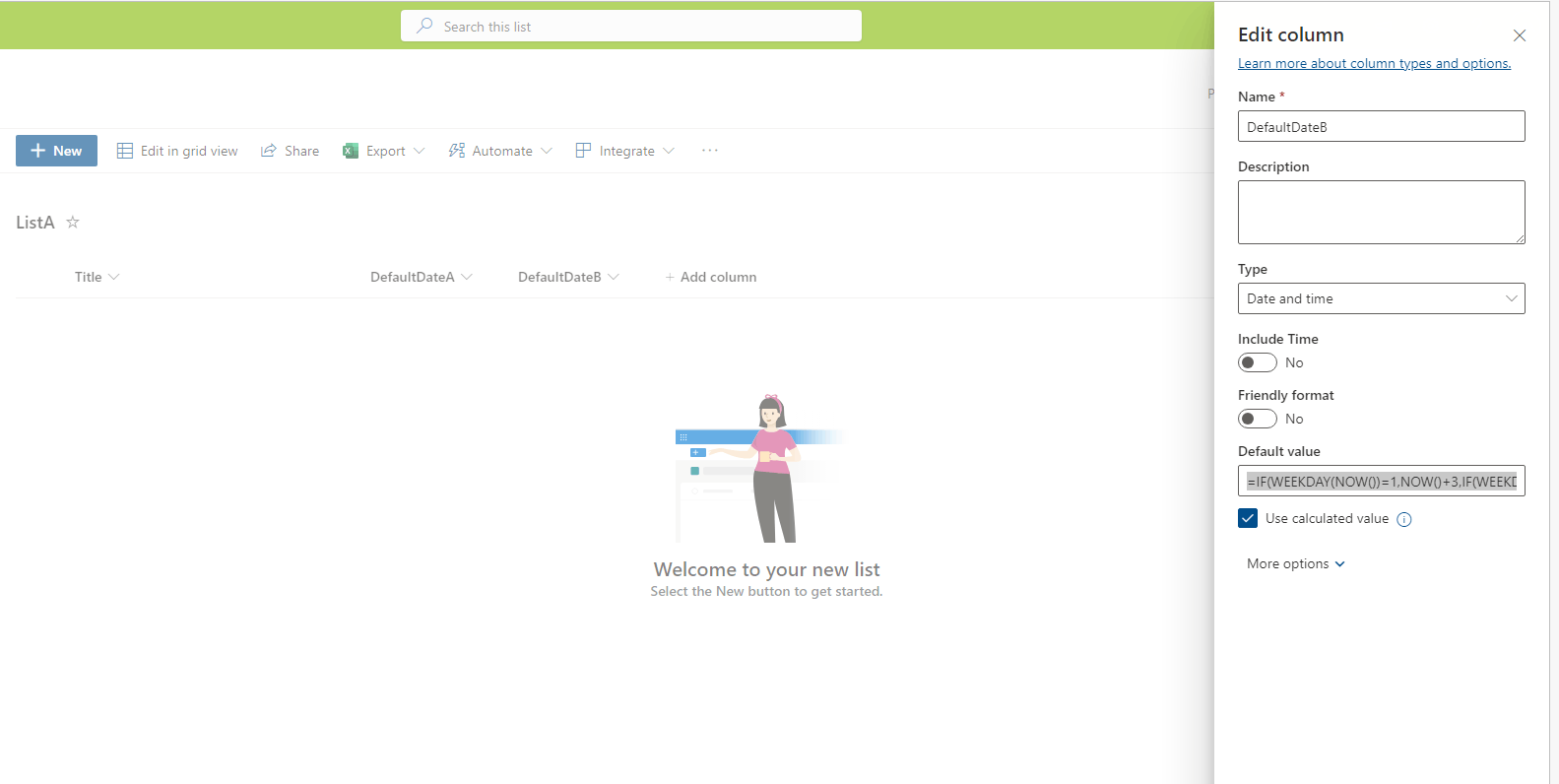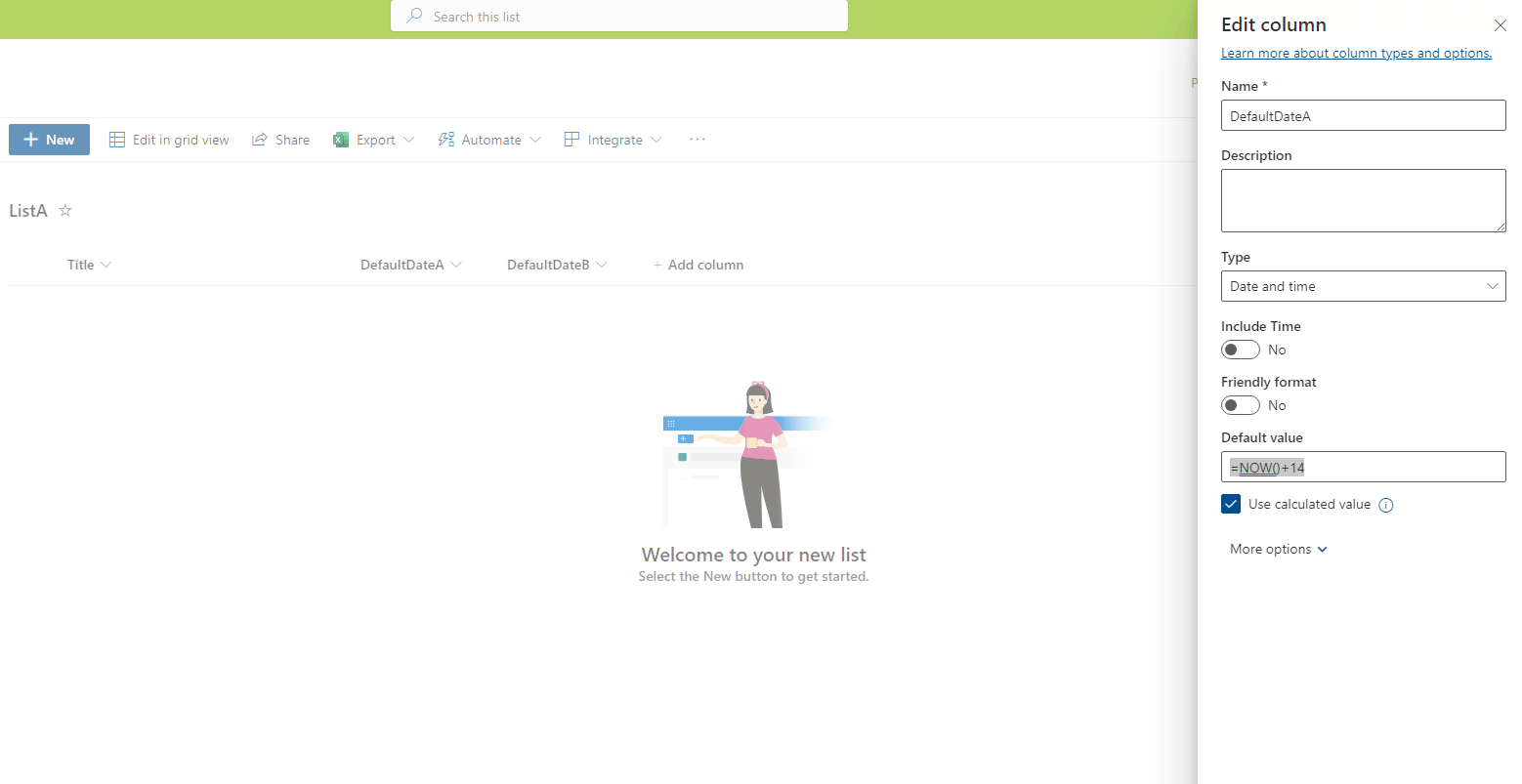 List 1 should be very simple but it has frequently failed to do proper calculations after the first few days or week after editing the column and saving. I've been using Default Value >> Calculated value: =TODAY()+14; =NOW()+14; =VALUE(TODAY())+14; =VALUE(TODAY()+14); =VALUE(NOW())+14; =VALUE(NOW()+14)
