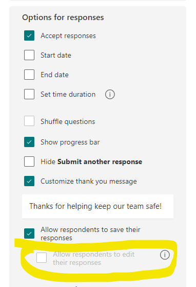 As per your detailed description and attached screenshots, we understand your scenario and from our tests, it seems like we can reproduce the same behavior that the group forms can only with the greyed out Allow respondents to edit option.