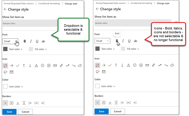 Based on your description, when you try to change style in SharePoint List column conditional formatting, icons don't work properly. I tested it on my side, and I could reproduce the same issue as yours.