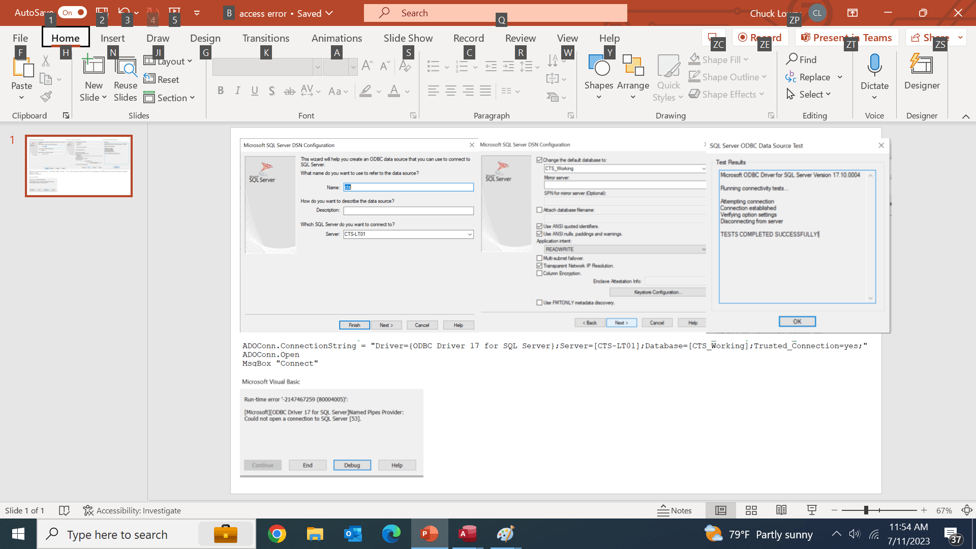 'ADOConn.ConnectionString = "ODBC;DRIVER={ODBC Driver 17 for SQL Server};SERVER=[CTS-LT01];DATABASE=[CTS_Working];Trusted_Connection=Yes;TrustServerCertificate=Yes;Description=MyApp"