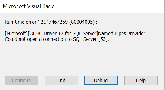 'ADOConn.ConnectionString = "DRIVER={ODBC Driver 17 for SQL Server};SERVER=[CTS-LT01];DATABASE=[CTS_Working];Trusted_Connection=Yes;TrustServerCertificate=Yes;Description=MyApp"