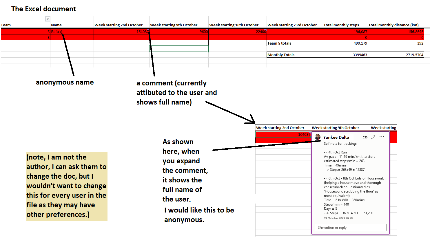 The issue is when I add a comment it comes up with my name, I do not believe there's a way currently to anonymise comments in a shared excel document.