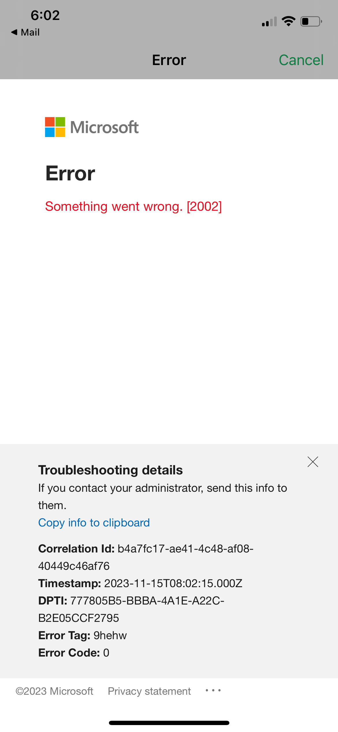 Currently, we have a temporary note about the error code 1001 Error “Something Went Wrong [1001]” signing in to Microsoft 365 Desktop Applications - Microsoft Support, but the error on your side is 2002, hence I will still share some more suggestions for you as below: