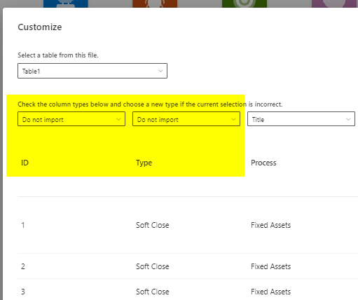 Based on our investigation, ID and Type are default existing columns in SharePoint list. These 2 columns are auto filled and contents inside is not customizable. Your first 2 columns names are conflict with the existing ones. Please change the column names, for example, IDs, Types, and check if it works.