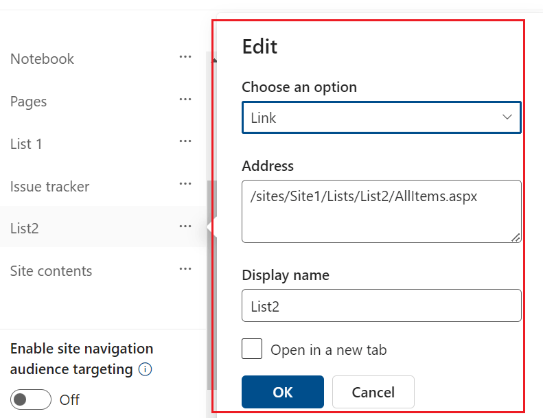However, if you want to direct the List 2 to different destination, you can edit the link in the Site Navigation of SharePoint Online site and change the link as per your requirement via below steps: