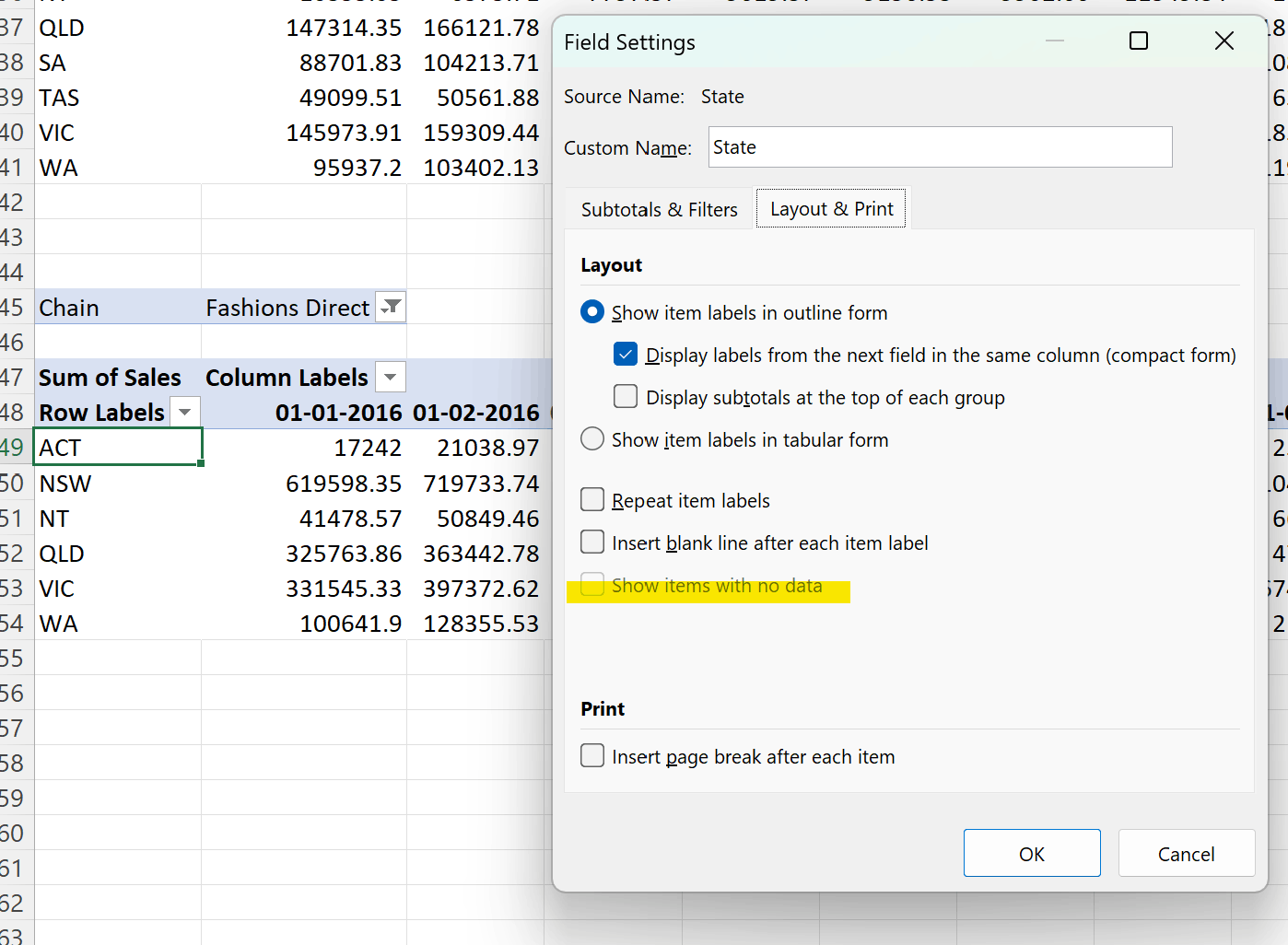 In the 'Display' tab in the following window, check the box for 'Show items with no data on rows'.