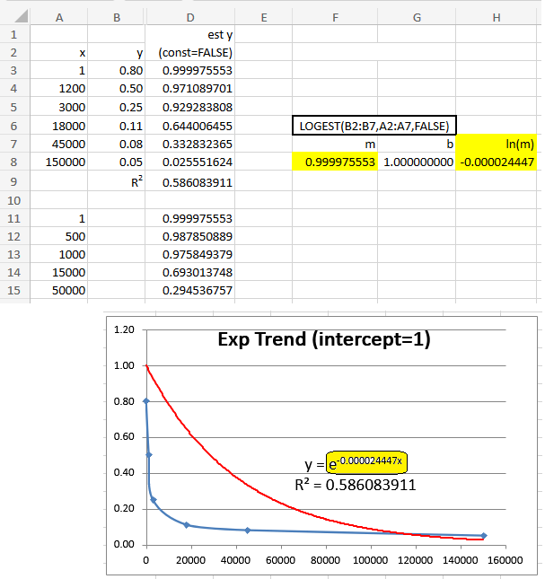 Or more simply, the single-valued function =GROWTH($B$3:$B$8, $A$3:$A$8, A3, FALSE) in D3, for example.