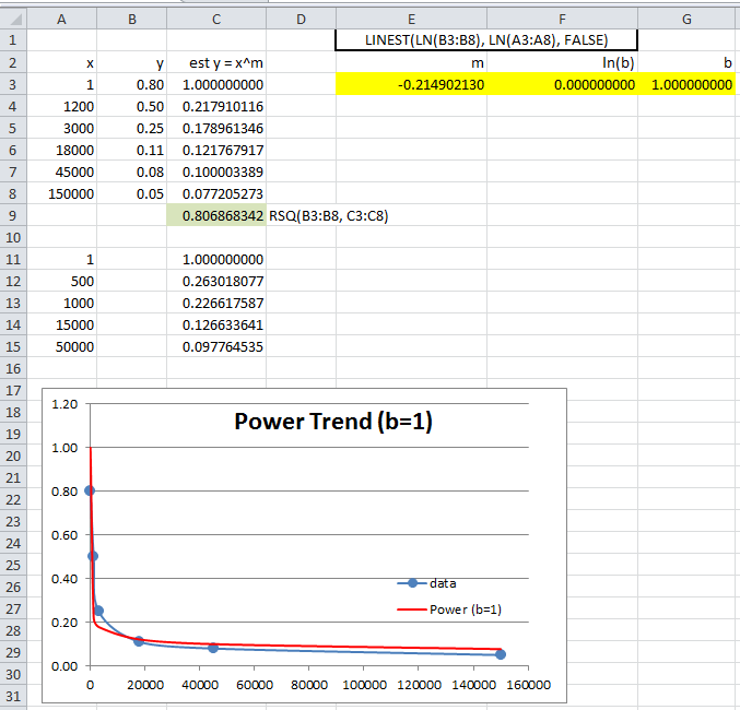 Aside.... In my version of Excel (YMMV), we cannot add a power trendline with intercept=1. So I created the equivalent by adding a chart series (in red) based on the values in C3:C8.