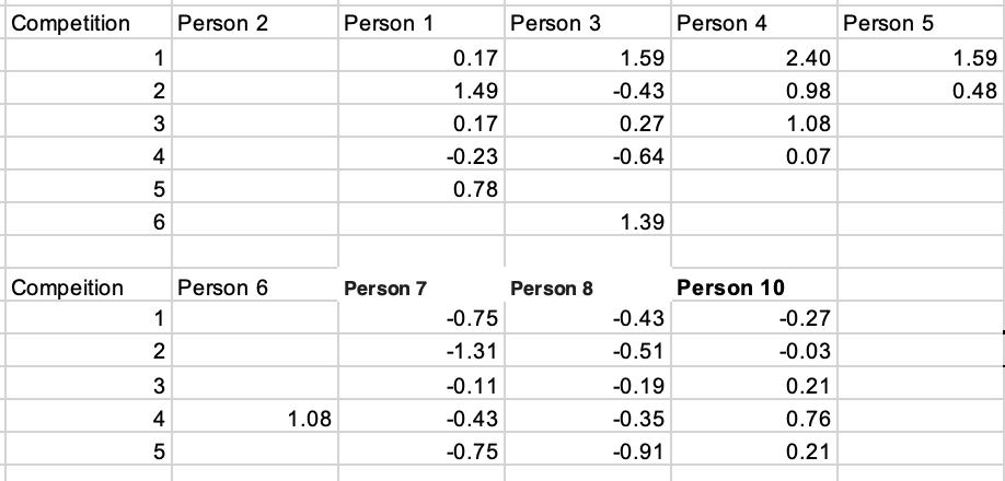 Here is a screenshot of what my data looks like. I have a feeling it is due to the blank cells but I cannot fill or remove the the blank cells. Not all participants completed during competition but I need to have the data for the ones that do. I don't know if that makes sense. I am ultimately looking for the ICCs for each individual grouping (I.e., they are different teams). However, I still keep getting the non-numeric input alert.