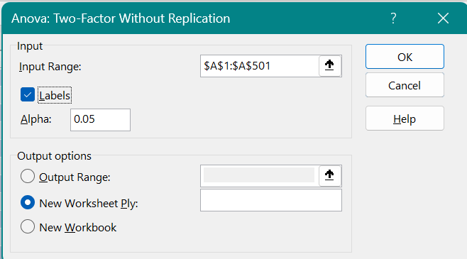 I am trying to run a ANOVA with two-factor without replication, however, I keep getting this alert that my input contains non-numeric data. I have tried to format it as a number and by using the text to column function but nothing seems to work. I do have data missing in my table but there is at least one values in each row (so I should be okay). I looking to find the ICC therefore I need the ANOVA information to do so. Please help.
