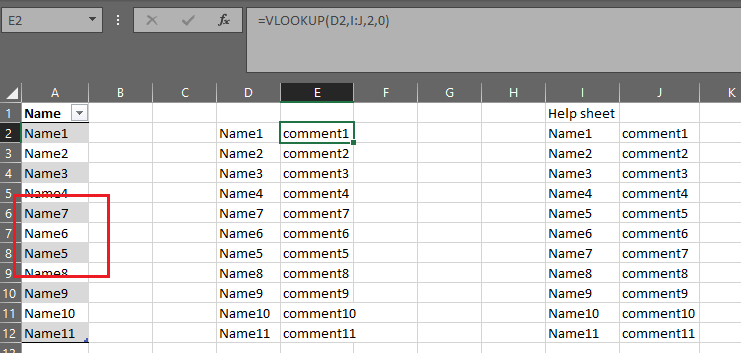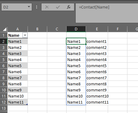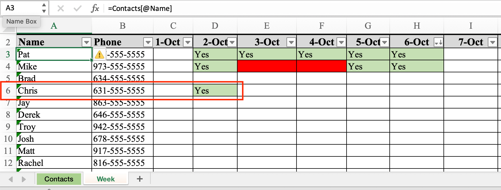 Cells C3:I12 are simple text. Columns A and B are linked to the Contacts table in the Contacts tab (as you can see in the formula bar). If I change the position of a name in the Contacts table, how can I get the corresponding row to change on the Week table?