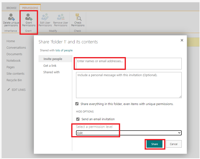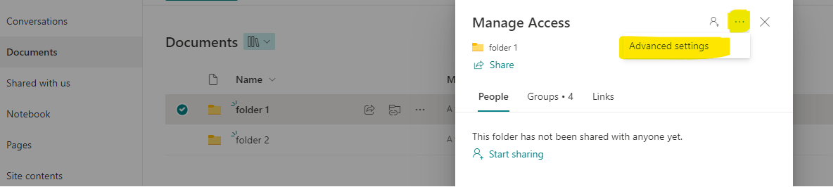 Select a folder and click the 3 dots next to it, choose Manage access > then click the 3 dots and click Advanced settings > click Stop Inheriting Permissions > then click Grant Permissions, enter email address of an individual participant, choose a permission level such as Edit, and click Share. Repeat these same steps for each folder in the Document library.