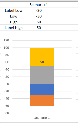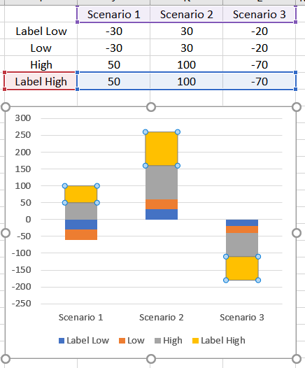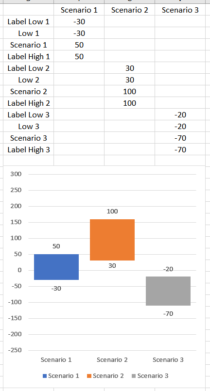 You want the data labels outside, Excel did not support that. Therefore we have to add 2 series that are below and above.