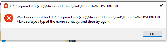 "windows cannot find 'c:\Program Files (x86)\Mircosoft Office\root\Office16\WINWORD.EXE'. Make sure you typed the name correctly, and then try again. "