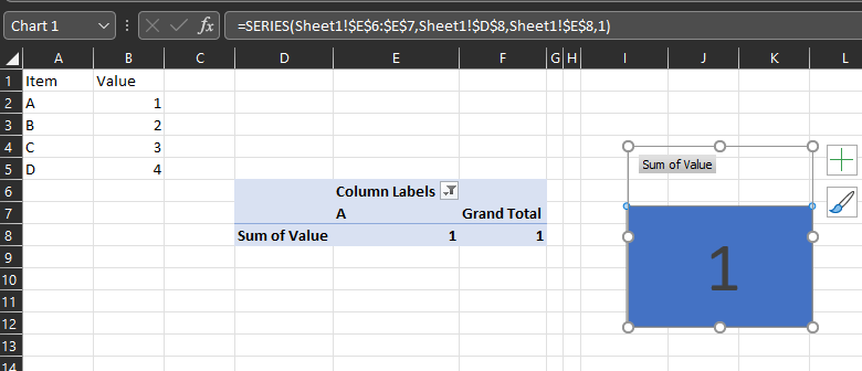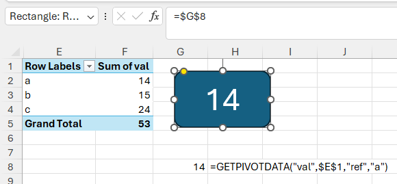 Problem No. 1 I'm facing is that I can't populate the data from PV table to the data cards, which are box shapes inserted and formated to display the PV table output. I select the data card box, and the enter "=" and go the PV table sheet and select the desired PV output field for example "pending" value. However I got an error message (see screenshot No. 3). But if I created in the PV table same sheet cells and use the same folmula, then these cells will refelct the PV table output. and then I can refrence these cells from the shapes and display the values.