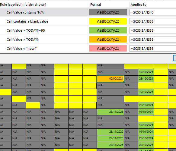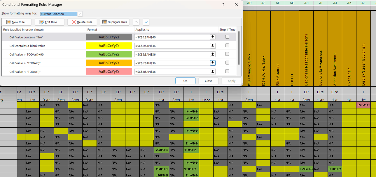 I have a training matrix setup which records training expiry dates, I have used conditional formatting to highlight cells which