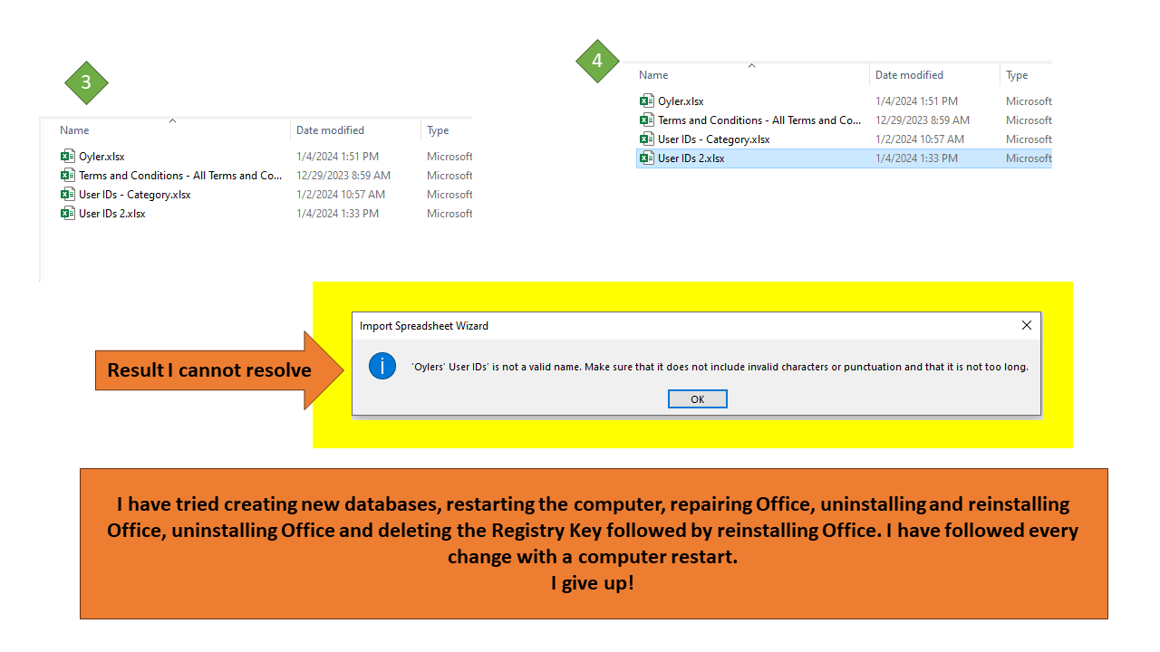 I have tried to import an Excel spreadsheet to create a new table in a fresh Access database. The first time I tried to import the table, I received an error message: "'Oylers' User IDs' is not a valid name. Make sure that it does not include invalid characters or punctuation and that it is not too long."