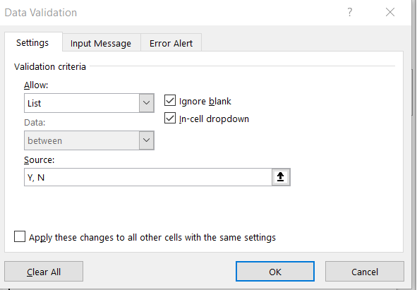 I was able to manipulate the code from the follow post of questions and answers. But I cannot figure out how to pull the Y/N option from a different sheet even though it is in the same workbook, and if the data validation option makes a different? Thank you!