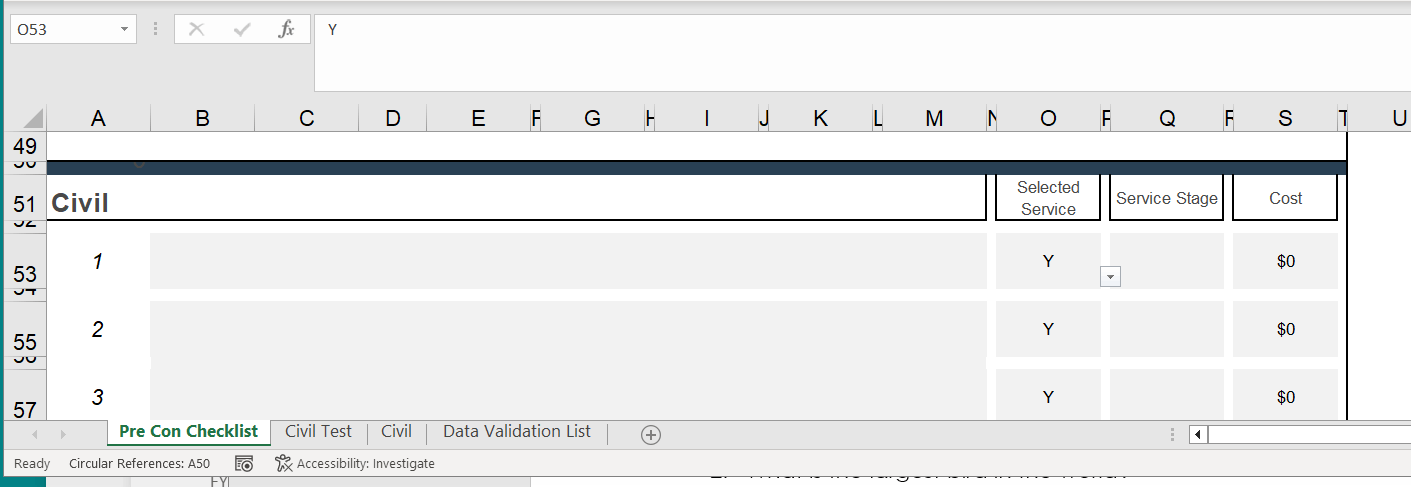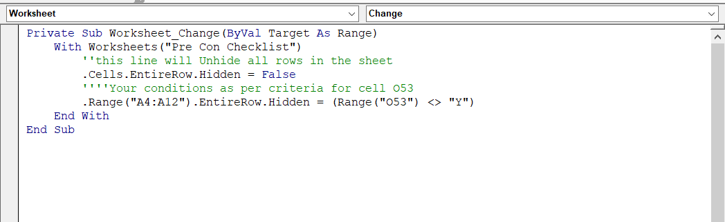 I'd like to hide a select number of rows on sheet 2(Civil Test) based of a drop down data validation cell value from sheet 1(Pre Con Checklist) and perform this several times within sheet 2(Civil Test) . The cell value from sheet 1 (Pre Con Checklist) is a drop down data validation cell with the only options being Y or N. If Y from cell (O53) on the Pre Con Checklist sheet is selected then I want a range of cells on sheet 2(Civil Test) to show. If N is selected or the cell is left blank, then I want the range of rows from sheet 2 to be hidden. I am able to do this if the Y or N selection is from the same sheet from the code below