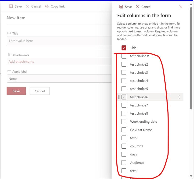 - click "New" to create a new item. In the right side pane, click "edit" icon >> edit columns >> untick the columns you don't want users to see when creating new item, save it.