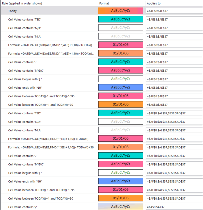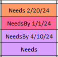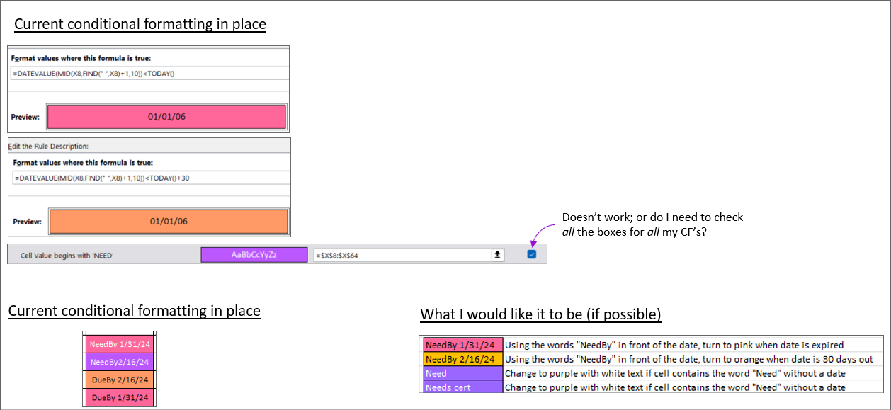I have a spreadsheet that I need to track expiration dates and needs. I have a conditional formatting formula to allow text prior to the date so that the CF will look at the date and change the cell color for 30/60/expired. I have a conditional formatting rule set up to change the cell to purple if the cell begins with the word Need. However, when I put the words NeedBy in front of the date, it also changes to purple. I thought of using the word DueBy instead of NeedBy but that isn't always going to be the case and won't make sense.