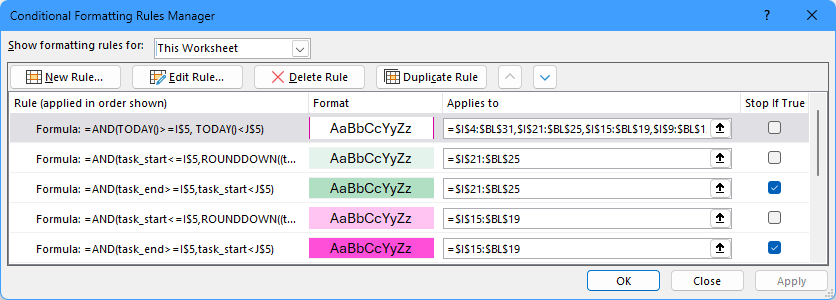You'll see the rules used to color the Gantt chart.