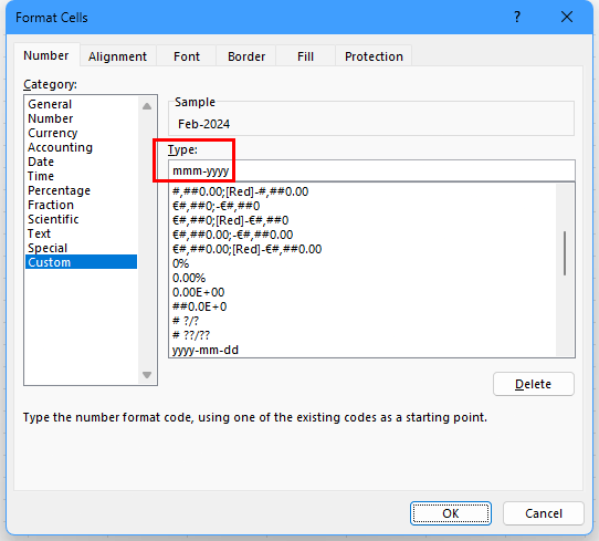 Enter mmm-yyyy in the Type box, overwriting whatever it already contained.