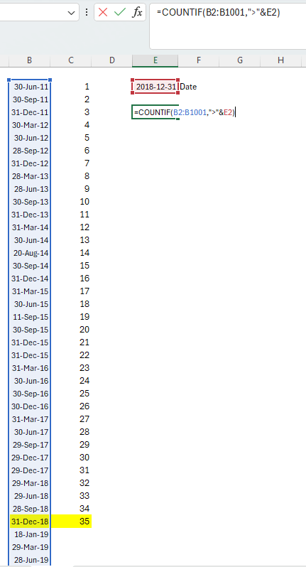 As you can see, I want it to return the number 35 since there are 35 cells that have values in the, before that date.