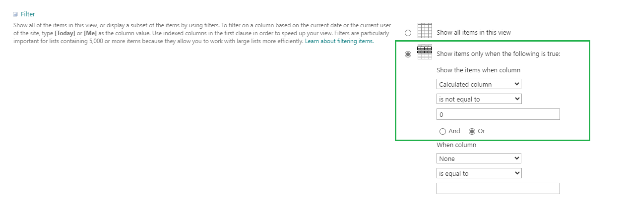 - Scroll down to Filter, choose Show items only when the following is true, select your calculated column, is not equal to 0. Then click OK on the bottom to save this setting.