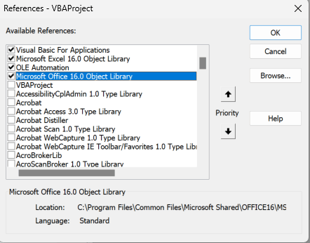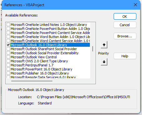 Scroll down the list until you see Microsoft Outlook 16.0 Object Library.