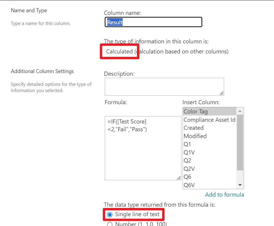 Syntax in Pass/Fail Column Formula section of Column Settings: =IF([Test Score]<39, "Fail","Pass")