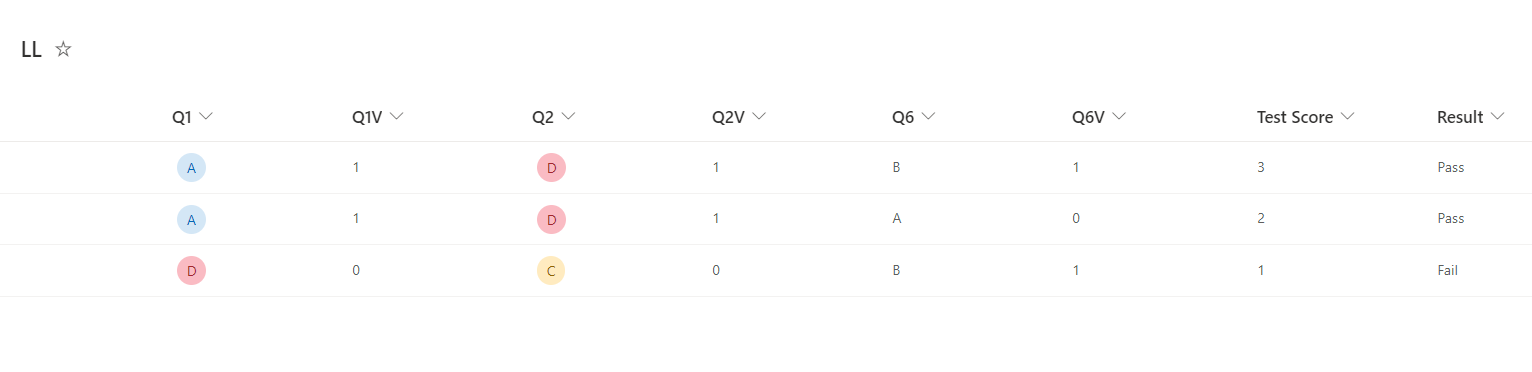 The first formula I am trying to use is to assign a value of "1" if the correct answer is submitted from a 40 question test submission (form response added to list) and "0" if the incorrect answer is submitted. i.e. Question 6 response is column name "Q6", the formula to assign value 1 or 0 is column name "Q6V". Correct answer is B.