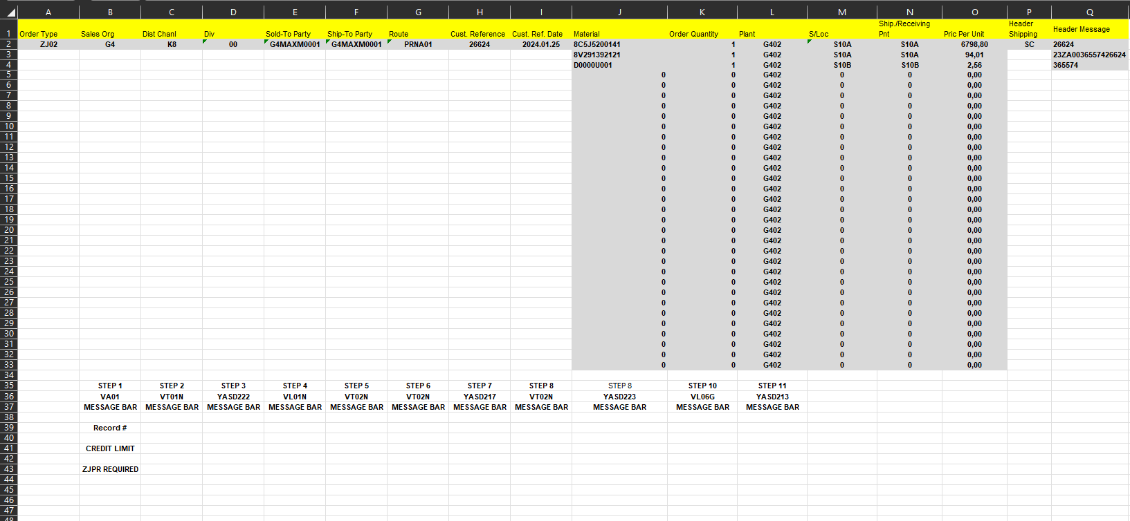 I can send additional screen shots of the various SAP steps in the specific T-CODE VA01 and where all excel data needs to be entered. The process is very time consuming and prone to human error and I'm hoping this can be automated to assist in accuracy of data upload and time efficiency.