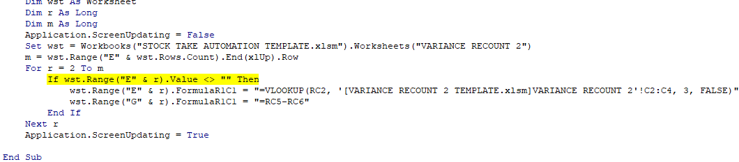 wst.Range("E" & r).FormulaR1C1 = "=VLOOKUP(RC2, 'VARIANCE RECOUNT 2 TEMPLATE'!C2:C4, 3, FALSE)"