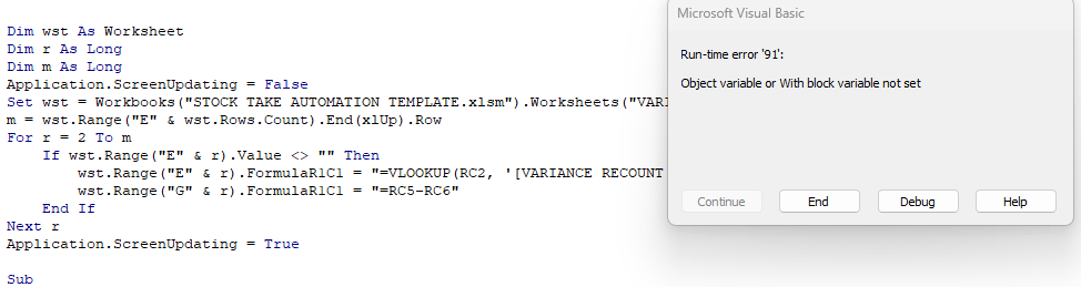 Set wst = Workbooks("STOCK TAKE AUTOMATION TEMPLATE.xlsm").Worksheets("VARIANCE RECOUNT 2")