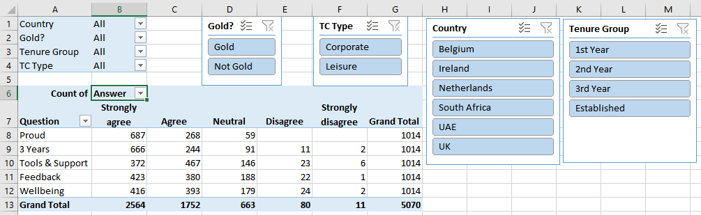 I have a survey I want to report on using a PivotTable and PivotChart (as I want to be able to manipulate the view using filters/splicers). I've managed to have the table show how I want with questions down the left and responses (strongly agree - strongly disagree) along the top and in the chart how I want - screenshot included and copy of the table below.