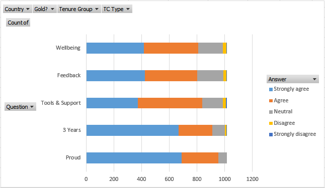 As you can see, all values are the same but in the raw data, they're not so for example, Proud should display 687 Strongly Agree, 267 Agree and 59 Neutral. All data seems to show for the Wellbeing question. I'm assuming that's because I'm using the Wellbeing question to produce the Strongly Agree to Strongly Disagree labels in the column section but I can't find a way to display these without doing that.