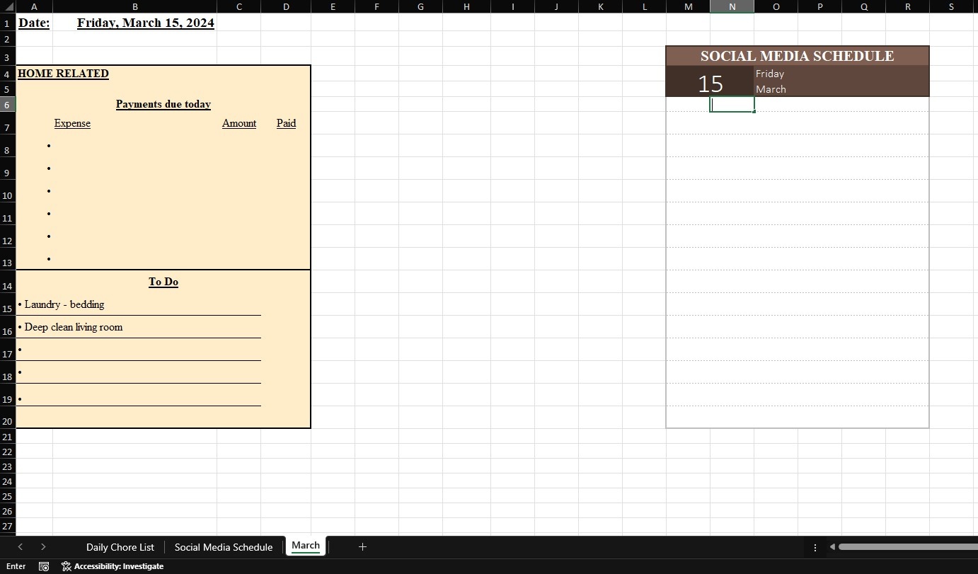 Create formulas that dynamically extract data from the "Social Media Schedule" page by referencing the date cell. For example, you can use a formula similar to this one if the date is in cell A1 on the "March" sheet: