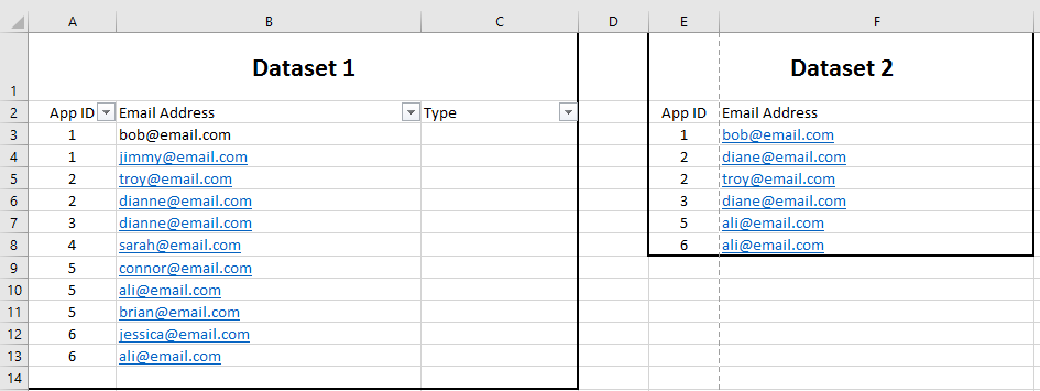 I am having trouble finding a working equation for two datasets that I have. The first dataset has about 2,000 email addresses associated with an App ID. I have a third column with the header "Type" (Column C) that is currently blank.