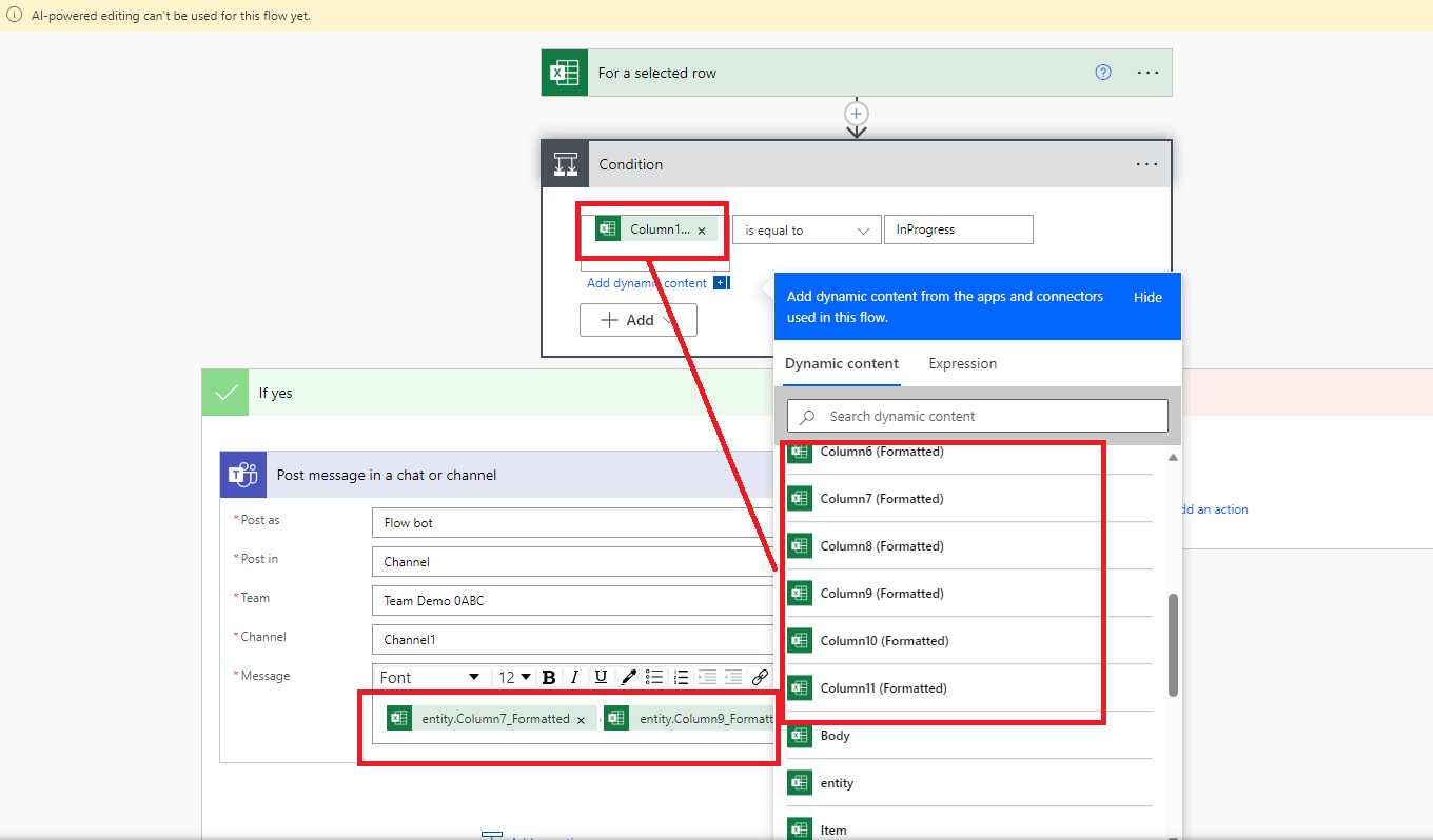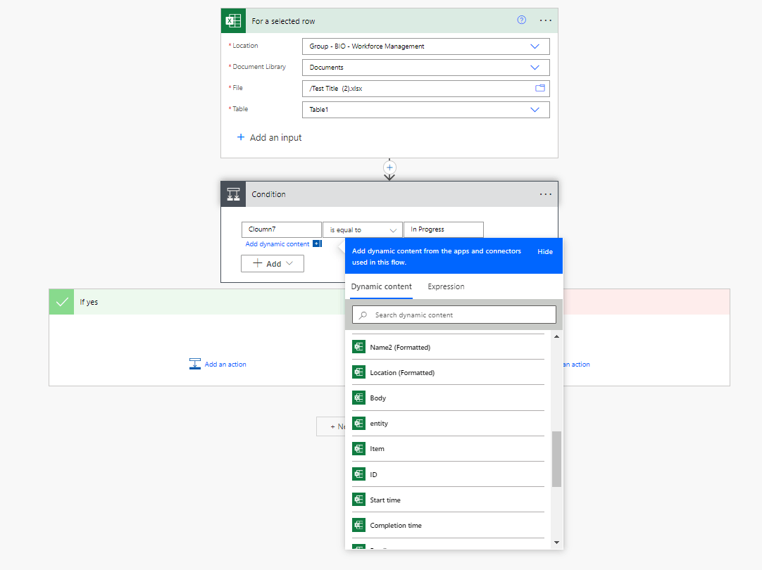 The dramatic column names should match the columns in the Excel file you are using. It is got from the For a selected row trigger.