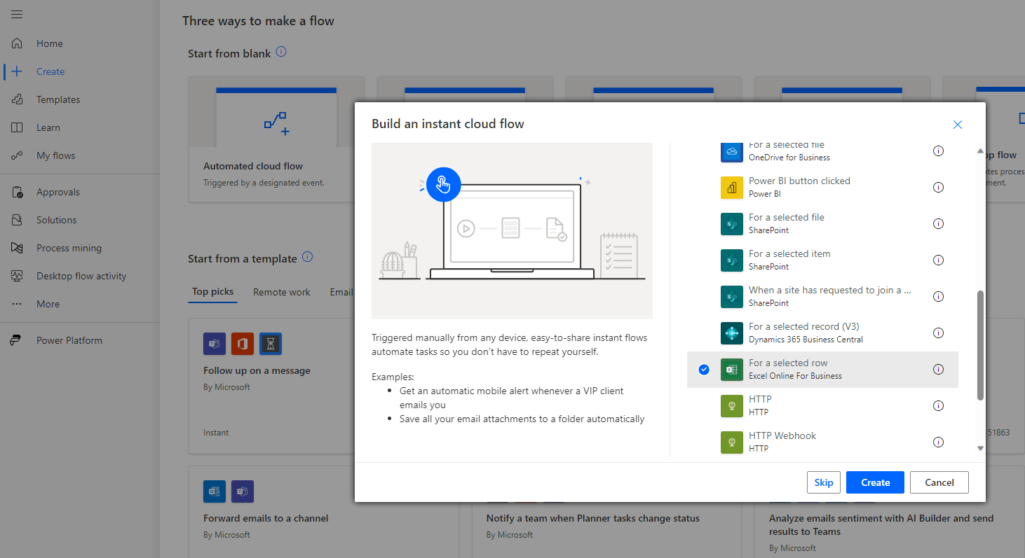 You can select the Instant cloud flow type>For a selected row in Power Automate to start creating the flow.