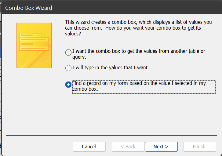 In this little demo file the first option, 'Open form to go to a record' illustrates a slightly more refined solution than that provided by the wizard. In the form is an unbound combo box control in which a contact can be selected by name, or the user can elect to enter a new contact.