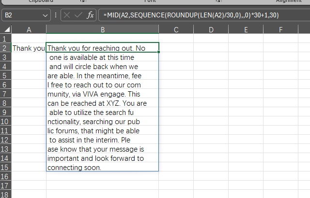 For example. I have the statement "Thank you for reaching out. No one is available at this time and will circle back when we are able. In the meantime, feel free to reach out to our community, via VIVA engage. This can be reached at XYZ. You are able to utilize the search functionality, searching our public forums, that might be able to assist in the interim. Please know that your message is important and look forward to connecting soon. "