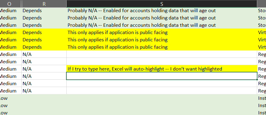 How do we prevent Excel from automatically highlighting a cell? It does this based on the highlight color of the cell above, and will even jump over up to 2 rows to match the highlighting above.