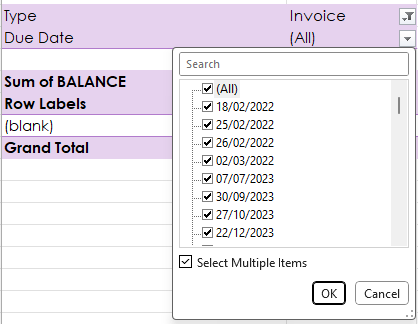 The same column of data (due date) is included in the filter of the Pivot table, but the dates are not bring grouped?