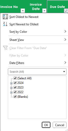 In my data I have a column of dates, I have checked this is in date format (not text) and when you filter the column, it groups correctly: