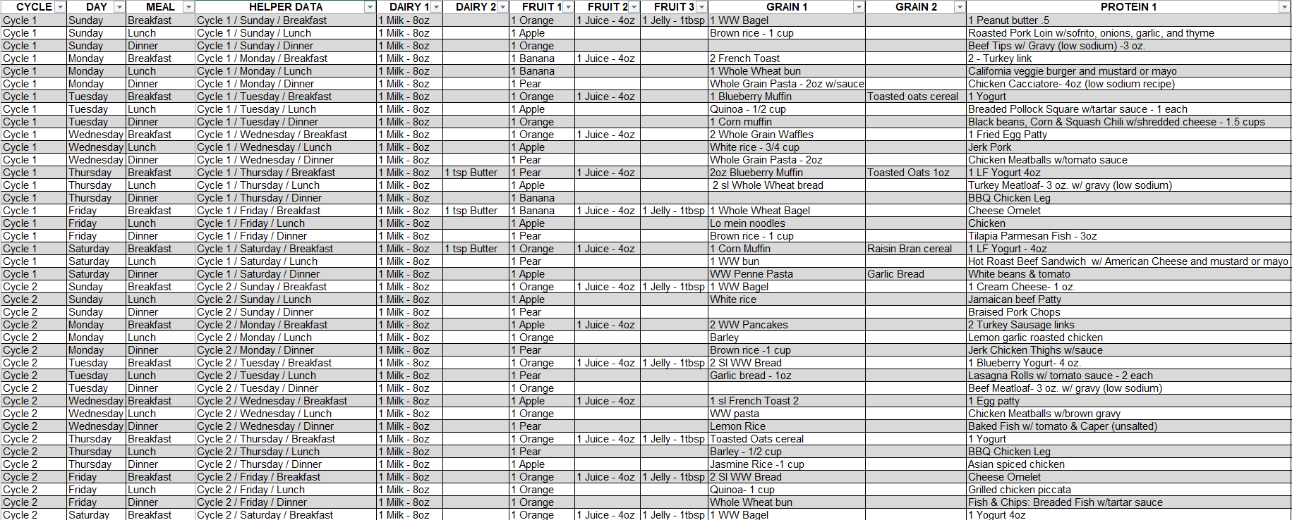 Trying to create an order form - the form itself has three drop down menus, from which data should be populated in the form itself. I have a full data table with a 'helper' column I've created, but can't seem to even figure out the right function to use (VLOOKUP? INDEX? others?) The "menu" area needs to populate based upon what is selected for Cycle/Day/Meal, each of which is a data validated drop-down.