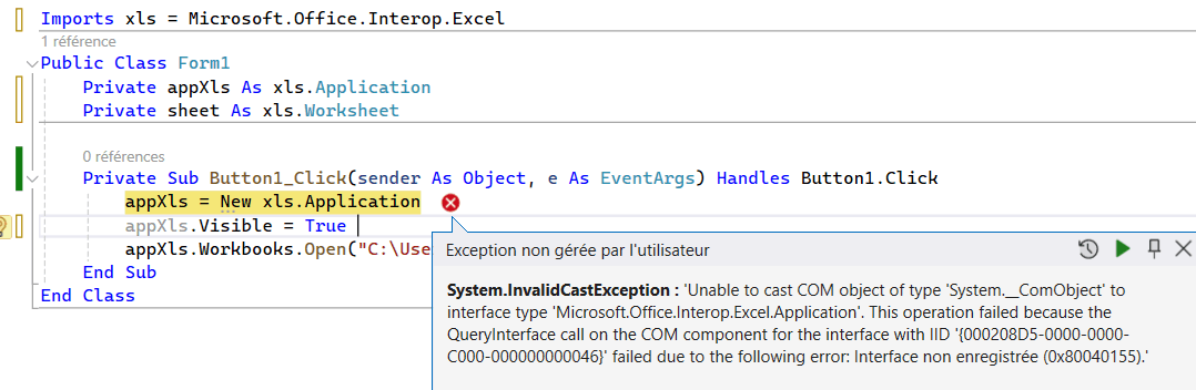The error you’re encountering is typically related to the COM registration of the Excel application not being correct or not matching the expected interface.