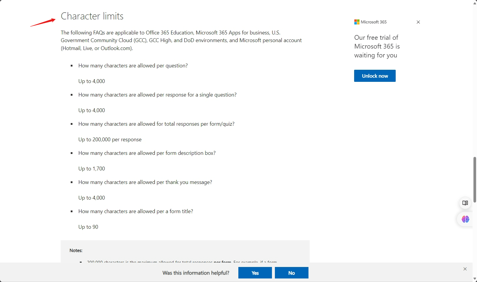 Thank you for your support of Microsoft products. Forms text fields are limited, they are limited to 4000 characters (characters include not only the subtitles you enter, but also all the symbols), while for the description box it is limited to 1700 characters, the form title is limited to 90 characters in length, and the total number of characters in the form is limited to 200000 characters.