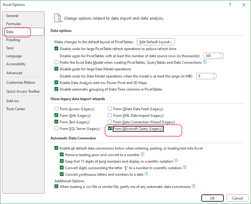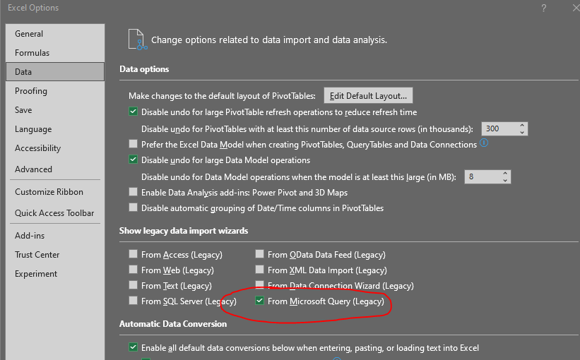 Unless it is hidden somewhere else that we are not seeing when enabling legacy, and it doesn't seem like it from the screenshot some else showed, we don't see that option, but we do see Legacy Wizard show up when legacy is enabled just no From Microsoft Query Option like the above screenshot shows. My users already gone for the week, or I'd jump in and grab a couple more screenshots, I can supply next week if needed.